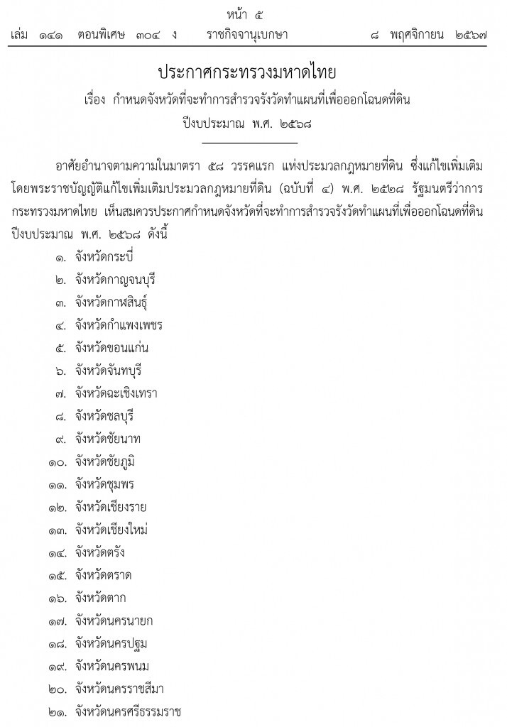 เว็บไซต์ราชกิจจานุเบกษา ได้เผยแพร่ ประกาศกระทรวงมหาดไทย เรื่อง กําหนดจังหวัดที่จะทําการสํารวจรังวัดทําแผนที่เพื่อออกโฉนดที่ดินปีงบประมาณ พ.ศ. ๒๕๖๘