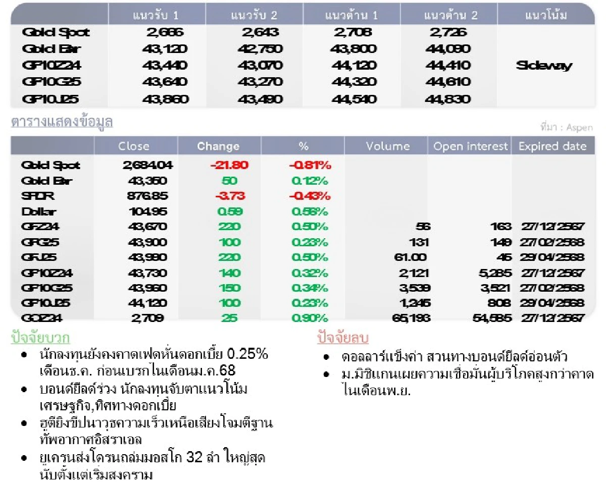 ราคาทองคำยังคงได้แรงหนุนจากเฟดปรับลดอัตราดอกเบี้ย 0.25% ในการประชุมประจำวันที่ 6-7 พ.ย. ประกอบกับปัจจัยทางด้านภูมิรัฐศาสตร์ที่ทวีความรุนแรงขึ้น หนุนทองคำในฐานะสินทรัพย์ปลอดภัย Gold Spot 2,670.06 U$/ทรอยเอาน์ซ (11 พ.ย. ณ เวลา 11.43 น.)