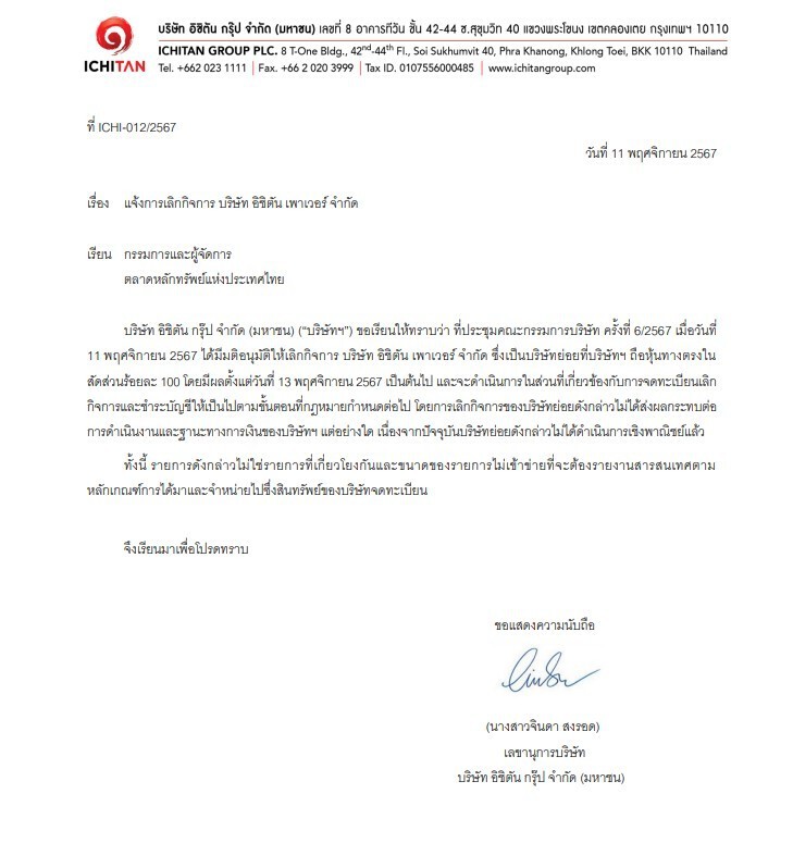 บริษัท อิชิตัน กรุ๊ป จำกัด (มหาชน) รายงานต่อตลาดหลักทรัพย์แห่งประเทศไทย ระบุว่า บริษัท อิชิตัน กรุ๊ป จำกัด (มหาชน) ขอเรียนให้ทราบว่า ที่ประชุมคณะกรรมการบริษัท ครั้งที่ 6/2567 เมื่อวันที่ 11 พฤศจิกายน 2567 ได้มีมติอนุมัติให้เลิกกิจการ บริษัท อิชิตัน เพาเวอร์ จำกัด ซึ่งเป็นบริษัทย่อยที่บริษัทถือหุ้นทางตรงในสัดส่วนร้อยละ 100 โดยมีผลตั้งแต่วันที่ 13 พฤศจิกายน 2567 เป็นต้นไป