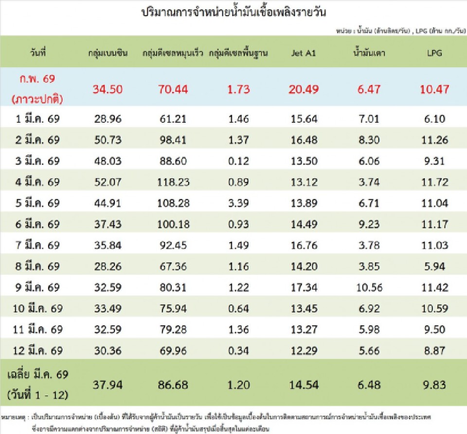 - ยอดการใช้น้ำมันดีเซลโดยเฉลี่ยช่วง 1-12 มี.ค. พุ่งสูงขึ้นเป็น 86.68 ล้านลิตรต่อวัน จากภาวะปกติที่ 70.44 ล้านลิตรต่อวัน