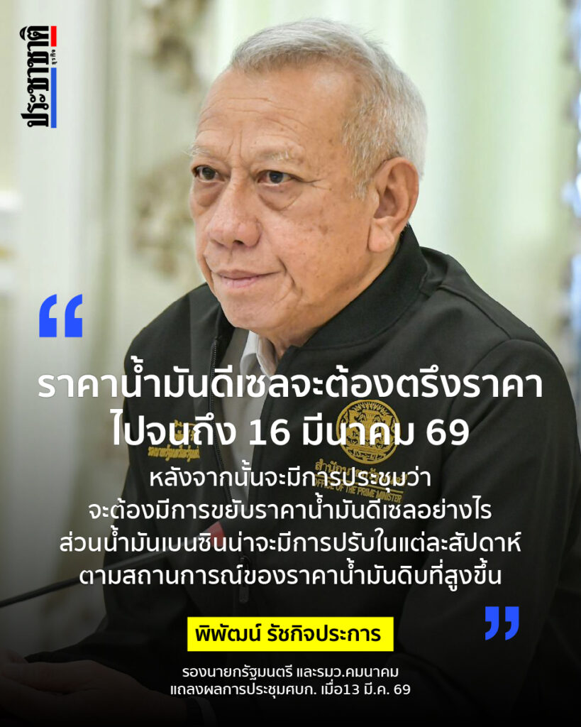 นายพิพัฒน์ รัชกิจประการ รองนายกรัฐมนตรี และรัฐมนตรีว่าการกระทรวงคมนาคม ในฐานะ ผอ.ศบก. แถลงภายหลังเป็นประธานการประชุมเพื่อติดตามและประเมินสถานการณ์การสู้รบในตะวันออกกลาง เมื่อ 13 มีนาคม 2569 โดยยืนยันถึงข้อสั่งการของนายกรัฐมนตรีในเรื่องของราคาน้ำมันดีเซล ที่จะต้องตรึงราคาไปจนถึงวันที่ 16 มีนาคม 2569 หลังจากนั้นจะมีการประชุมกับหน่วยงานที่มีส่วนเกี่ยวข้องว่าหลังครบกำหนด 15 วันจะต้องมีการขยับราคาน้ำมันดีเซลอย่างไร