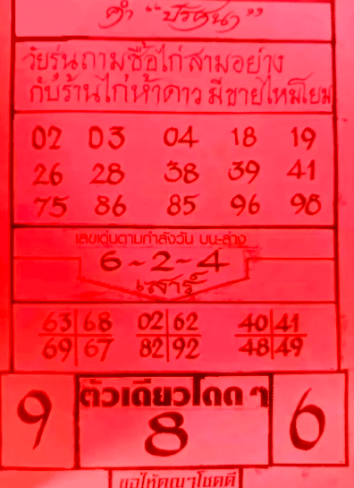 - เลขท้ายสองตัว ชุดที่ 1 : 02 – 03 – 04 – 18 – 19 – 26 – 28 – 38 – 39 – 41 – 75 – 86 – 85 – 96 – 98