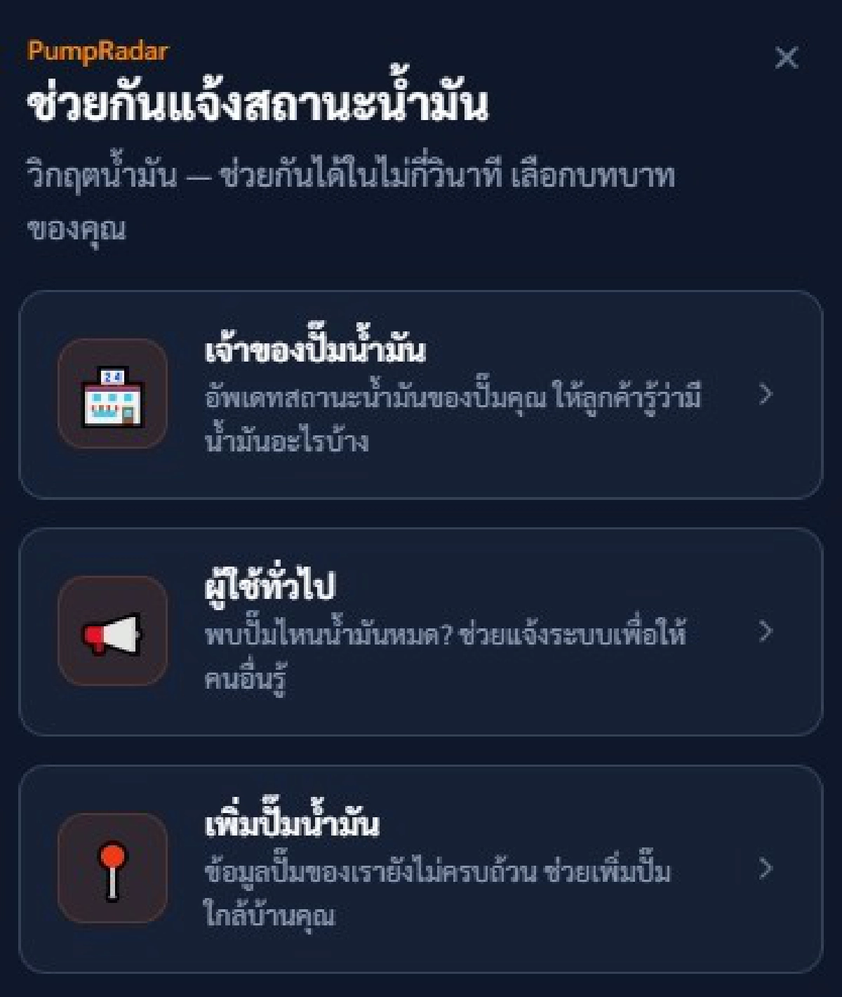 ช่วยกันอัปเดต : หากคุณอยู่ที่ปั๊มแล้วพบว่าน้ำมันหมด หรือยังมีน้ำมันเหลืออยู่ การกดรายงานสถานะจะช่วยเพื่อนร่วมทางคนอื่นได้มหาศาล