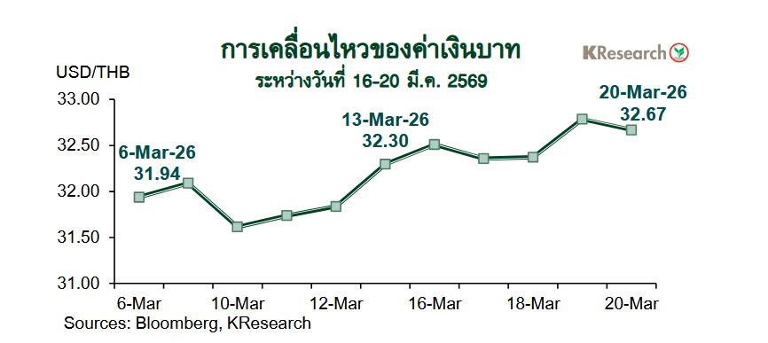 ส่วนสัปดาห์หน้า หรือระหว่างวันที่ 23-27 มี.ค. 2569 ธนาคารกสิกรไทยมองกรอบการเคลื่อนไหวของค่าเงินบาทที่ระดับ 32.30-33.20 บาทต่อดอลลาร์ฯ ขณะที่ศูนย์วิจัยกสิกรไทยประเมินปัจจัยสำคัญที่ต้องติดตาม ได้แก่ ตัวเลขการส่งออกเดือนก.พ. ของไทย สถานการณ์ในตะวันออกกลาง ทิศทางราคาน้ำมันในตลาดโลก ฟันด์โฟลว์ของต่างชาติและ ถ้อยแถลงของเจ้าหน้าที่เฟด