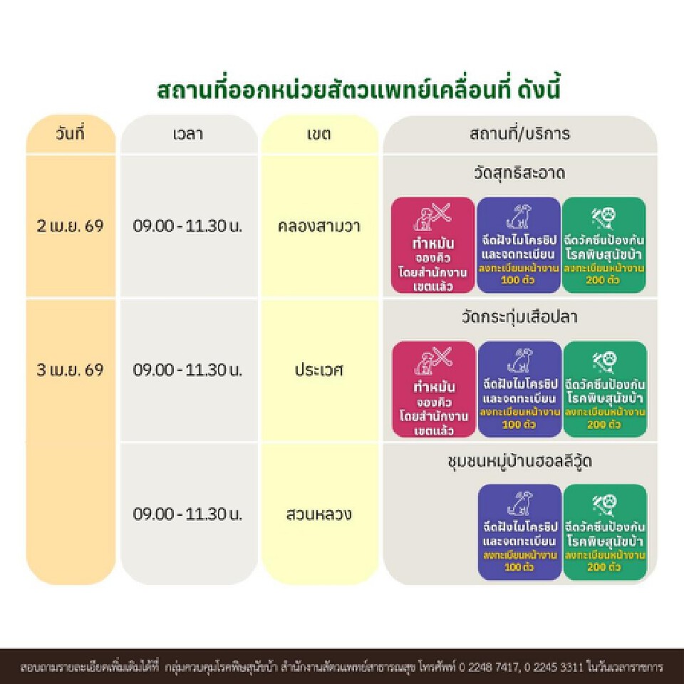 มีกำหนดการออกหน่วยในหลายพื้นที่ทั่วกรุงเทพฯ เช่น เขตจตุจักร วังทองหลาง บางกะปิ คลองสาน ตั้งแต่วันที่ 31 มีนาคม - 5 เมษายน 2569