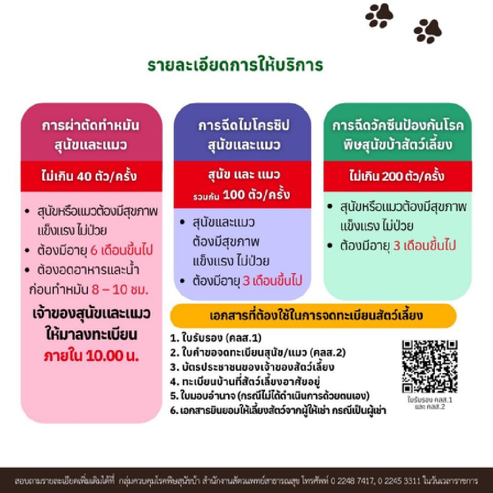 การทำหมันต้องจองคิวล่วงหน้าผ่านสำนักงานเขต ส่วนการฉีดวัคซีนและไมโครชิปสามารถลงทะเบียนได้ที่หน้างานตามจำนวนที่กำหนด