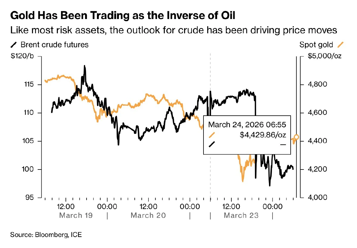 ราคาทองคำทรงตัวเหนือ 4,400 ดอลลาร์ต่อออนซ์ ในการซื้อขายช่วงเช้า หลังจากที่ร่วงลงอย่างหนักในวันจันทร์ ทำให้ปิดตลาดลดลงเกือบ 2% สงครามในตะวันออกกลางทำให้ราคาน้ำมันสูงขึ้น และเพิ่มความเสี่ยงต่อภาวะเงินเฟ้อ และอัตราดอกเบี้ยที่สูงขึ้น ส่งผลให้ราคาทองคำลดลงติดต่อกัน 9 วัน ซึ่งเป็นการลดลงติดต่อกันยาวนานที่สุดนับตั้งแต่ปี 2023