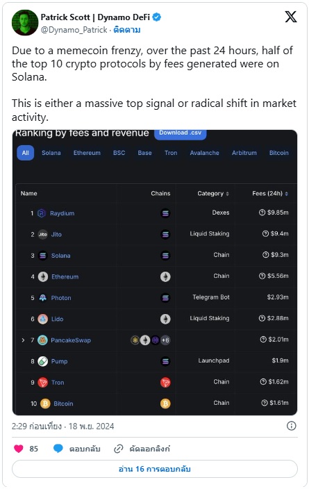 Patrick Scott นักวิเคราะห์ DeFi ได้โพสต์บน X เมื่อวันที่ 18 พฤศจิกายน โดยอ้างอิงข้อมูลจาก DefiLlama ว่า 5 ใน 10 โปรโตคอลที่มีค่าธรรมเนียมสูงสุดใน 24 ชั่วโมงที่ผ่านมาอยู่บน Solana
