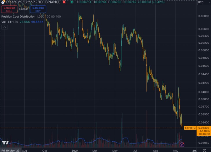 มูลค่าของ Ethereum เหรียญ altcoins อันดับหนึ่งเมื่อเทียบกับ Bitcoin ได้ร่วงลงแตะจุดต่ำสุดในรอบ 4 ปี หลังจากที่บิทคอยน์สามารถทำราคาทะลุ $94,000 ได้สำเร็จ คู่เทรด ETH/BTC ได้ร่วงลงมาที่ 0.03302 BTC ซึ่งเป็นจุดที่ต่ำมาก ๆ เมื่อเทียบกับปี 2023 ที่สูงกว่าระดับ 0.070 BTC