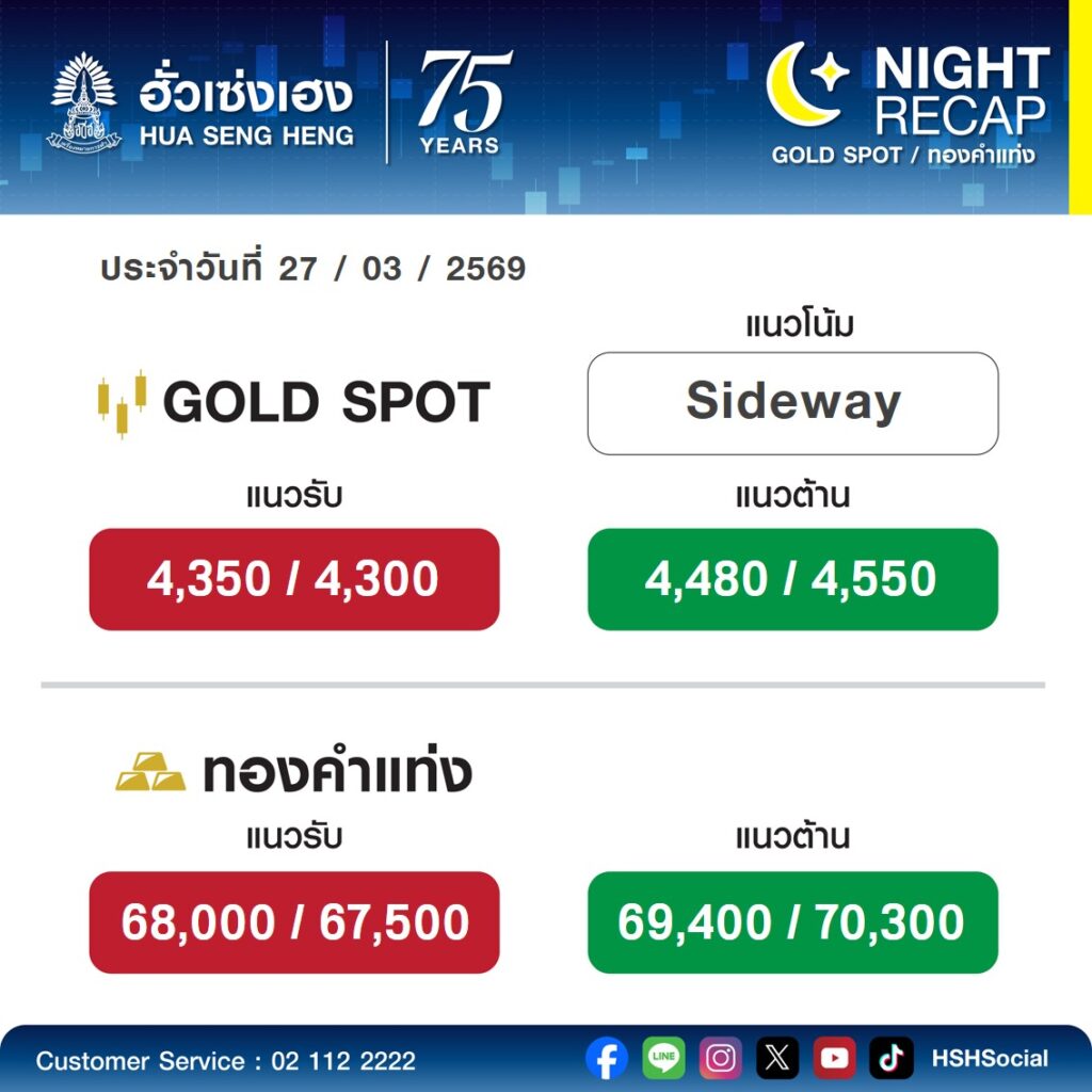ปลายสัปดาห์ที่ผ่านมา( 27 มี.ค.69 ฮั่วเซ่งเฮง วิเคราะห์แนวดน้มราคทองว่า ทองโลกยังคงทรงตัวในกรอบแนวรับ / ต้าน จากการที่ดัชนีเงินดอลลาร์ (DXY) มีแนวโน้มปรับตัวขึ้นเป็นวันที่ 3 สู่ระดับ 99.97 หน่วย จาก 99.19 หน่วย อีกทั้งบอนด์ยีลด์สหรัฐฯ อายุ 10 ปี มีแนวโน้มปรับตัวขึ้นเป็นที่ 2 สู่ระดับ 4.45% จาก 4.34% สืบเนื่องมาจากปธน.ทรัมป์ ได้ตัดสินใจเลื่อนเส้นตายในการโจมตีโครงสร้างพื้นฐานด้านพลังงานของอิหร่านออกไปอีก 10 วัน ซึ่งเป็นการสร้างความไม่แน่นอนให้ข้ามไปสู่เดือนเมษายน