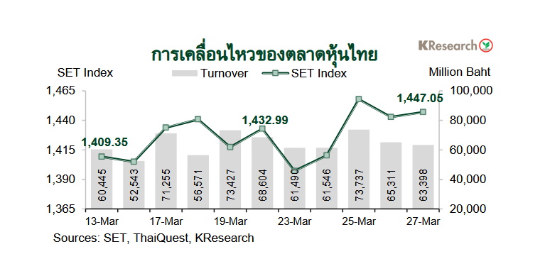 ส่วนสัปดาห์ถัดไป (30 มี.ค. – 3 เม.ย. 2569) บริษัทหลักทรัพย์กสิกรไทย จำกัด มองว่า ดัชนีหุ้นไทยมีแนวรับที่ 1,430 และ 1,410 จุด ขณะที่แนวต้านอยู่ที่ 1,465 และ 1,490 จุด ตามลำดับ