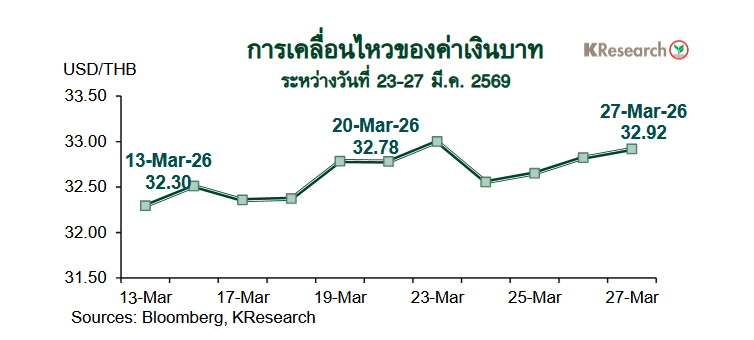 ในวันศุกร์ที่ 27 มี.ค. 2569 เงินบาทปิดตลาดในประเทศที่ 32.92 บาทต่อดอลลาร์ฯ (แตะระดับอ่อนค่าสุดในรอบ 10 เดือนที่ 33.06 ในระหว่างสัปดาห์) เทียบกับระดับ 32.78 บาทต่อดอลลาร์ฯ ในวันศุกร์ก่อนหน้า (20 มี.ค.)