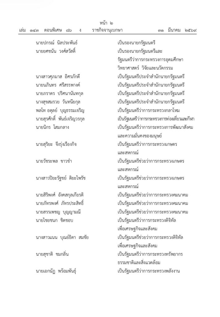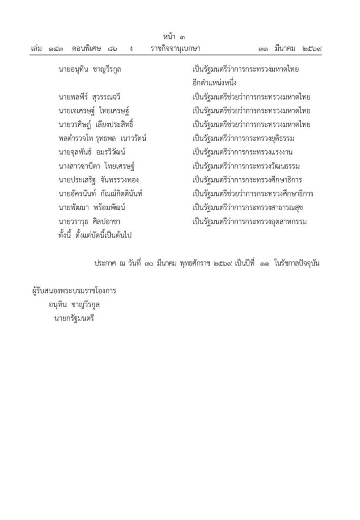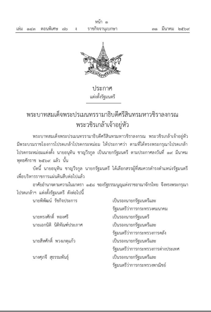 ผู้สื่อข่าวรายงานว่า วันนี้( 31 มีนาคม 2569) ราชกิจจานุเบกษา เล่ม 143 ตอนพิเศษ 86 ง ได้เผยแพร่พระบรมราชโองการ ประกาศแต่งตั้งรัฐมนตรี มีนายอนุทิน ชาญวีรกูล นายกรัฐมนตรี เป็นผู้รับสนองพระบรมราชโองการ มีใจความว่า
