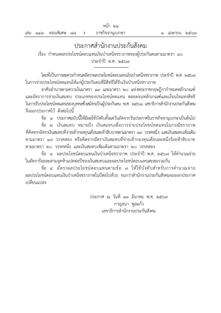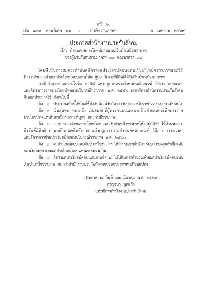ราชกิจจานุเบกษา เผยแพร่ประกาศประกันสังคม กำหนดอัตราผลประโยชน์เงินบำเหน็จผู้ประกันตน ม.33 ม.39 ม.40