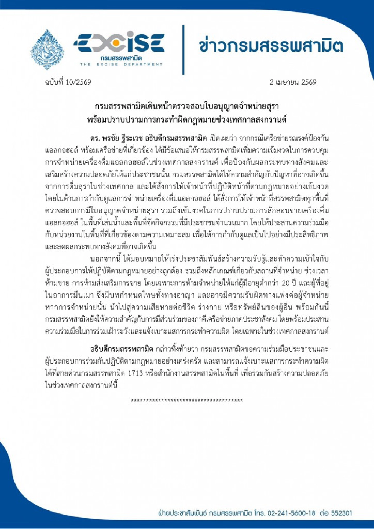 ดร. พรชัย ฐีระเวช อธิบดีกรมสรรพสามิต เปิดเผยว่า จากกรณีเครือข่ายรณรงค์ป้องกัน แอลกอฮอล์ พร้อมเครือข่ายที่เกี่ยวข้อง ได้มีข้อเสนอให้กรมสรรพสามิตเพิ่มความเข้มงวดในการควบคุมการจำหน่ายเครื่องดื่มแอลกอฮอล์ในช่วงเทศกาลสงกรานต์ เพื่อป้องกันผลกระทบทางสังคมและเสริมสร้างความปลอดภัยให้แก่ประชาชนนั้น กรมสรรพสามิตได้ให้ความสำคัญกับปัญหาที่อาจเกิดขึ้นจากการดื่มสุราในช่วงเทศกาล และได้สั่งการให้เจ้าหน้าที่ปฏิบัติหน้าที่ตามกฎหมายอย่างเข้มงวดโดยในด้านการกำกับดูแลการจำหน่ายเครื่องดื่มแอลกอฮอล์ ได้สั่งการให้เจ้าหน้าที่สรรพสามิตทุกพื้นที่ตรวจสอบการมีใบอนุญาตจำหน่ายสุรา รวมถึงเข้มงวดในการปราบปรามการลักลอบขายเครื่องดื่มแอลกอฮอล์ ในพื้นที่เล่นน้ำและพื้นที่จัดกิจกรรมที่มีประชาชนจำนวนมาก โดยให้ประสานความร่วมมือกับหน่วยงานในพื้นที่ที่เกี่ยวข้องตามความเหมาะสม เพื่อให้การกำกับดูแลเป็นไปอย่างมีประสิทธิภาพ และลดผลกระทบทางสังคมที่อาจเกิดขึ้น