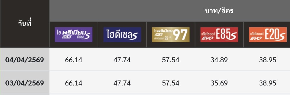 ลดราคาน้ำมันเบนซิน แก๊สโซฮอล์อี 85 (E85) ลง 0.80 บาทต่อลิตรวันนี้ (4 เม.ย. 69)