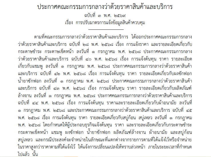 ผู้สื่อข่าวรายงานว่า ราชกิจจานุเบกษา เล่ม 143 ตอนพิเศษ 90 ง เมื่อวันที่ 3 เมษายน 2569 ได้เผยแพร่ประกาศคณะกรรมการกลางว่าด้วยราคาสินค้าและบริการ ฉบับที่ 3 พ.ศ.2569 เรื่องการปรับมาตรการแจ้งข้อมูลสินค้าควบคุม ลงนามโดยศุภจี สุธรรมพันธุ์ รัฐมนตรีว่าการกระทรวงพาณิชย์ ในฐานะประธานคณะกรรมการกลางว่าด้วยราคาสินค้าและบริการ
