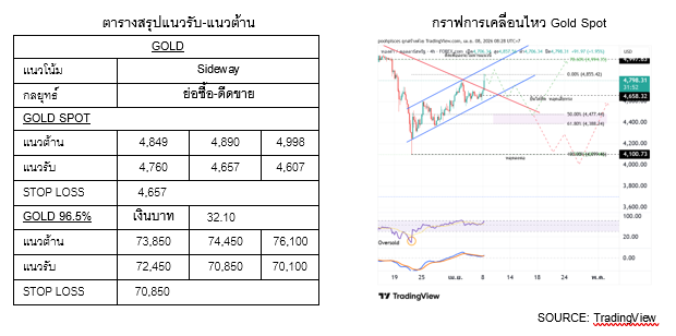 วานนี้ ราคาพักตัวลง แต่เพราะราคาสามารถยืนเหนือแนวรับแรกบริเวณ $4,602 ได้อย่างต่อเนื่อง ทำให้ราคามีจังหวะดีดทดสอบต้านอีกครั้ง สำหรับวันนี้ดูแนวรับบริเวณ $4,687-4,657 หากยืนได้ยังมองเป็นการย่อตัวเพื่อขึ้นต่อ โดยมีโซนแนวรับแรกบริเวณ $4,760 อย่างไรก็ดีหากการปรับตัวขึ้นของราคาไม่ผ่าน $4,890-4,998 ยังต้องระวังว่าเป็นการดีดตัวเพื่อลงต่อ เปิดสถานะซื้อ หากราคาไม่หลุด $4,760-4,657 (ตัดขาดทุนหากราคาดีดผ่าน $4,657) ขายทำกำไรหากไม่ผ่าน $4,489-4,890 หากผ่าน $4,890 ชะลอการขายไปที่แนวต้านถัดไป