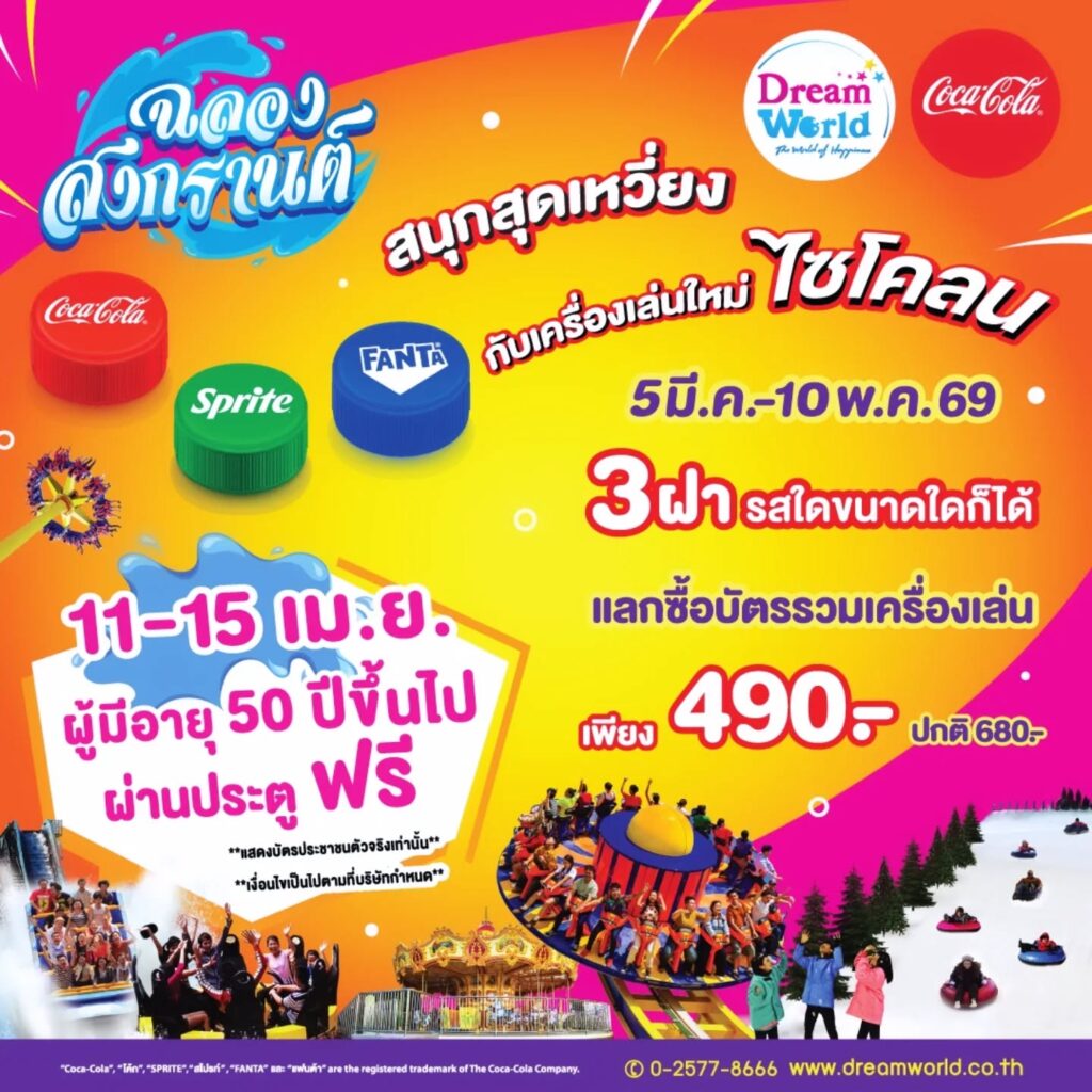 ดรีมเวิลด์ชวนเที่ยววันสงกรานต์ 2569 ผู้มีอายุ 50 ปีขึ้นไปผ่านประตูฟรี เพียงแสดงบัตรประชาชน ตั้งแต่ 11-15 เมษายนนี้ พร้อมโปรโมชั่นแลกซื้อบัตรรวมเครื่องเล่นราคาพิเศษ จนถึง 10 พฤษภาคมนี้