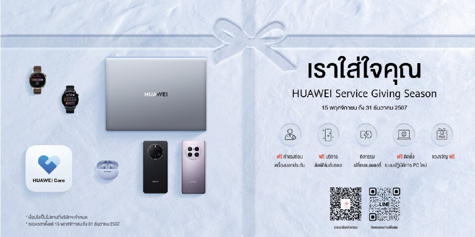 แคมเปญ HUAWEI Service Giving Season ให้บริการตั้งแต่ ระหว่างวันที่ 15 พฤศจิกายน 2567 ถึง 31 ธันวาคม 2567 ที่ ศูนย์บริการที่ได้รับอนุญาตจากหัวเว่ยทั่วประเทศ โดยมาพร้อมข้อเสนอสุดพิเศษมากมายถึง 6 รายการ ดังนี้: