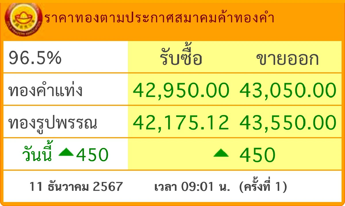 รายงานราคาทองวันนี้ ล่าสุด 11 ธันวาคม 2567 สมาคมค้าทองคำ ประกาศครั้งที่ 1 (เปิดตลาด) เมื่อเวลา 09.01 น. ปรับตัวเพิ่มขึ้นแรง 450 บาท สู่บริเวณ 43,050 บาท เมื่อเทียบกับประกาศราคาซื้อขายครั้งสุดท้ายของเมื่อวาน(อังคาร) ที่ระหว่างวันมีการประกาศราคาทองทั้งหมด 5 รอบ รวมราคาปรับตัวเพิ่มขึ้นเล็กน้อย 50 บาท
