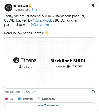 ที่มา :Ethena Labs เปิดตัว USDtb Stablecoin - หนุนโดย BlackRock - Cryptonews Thailand