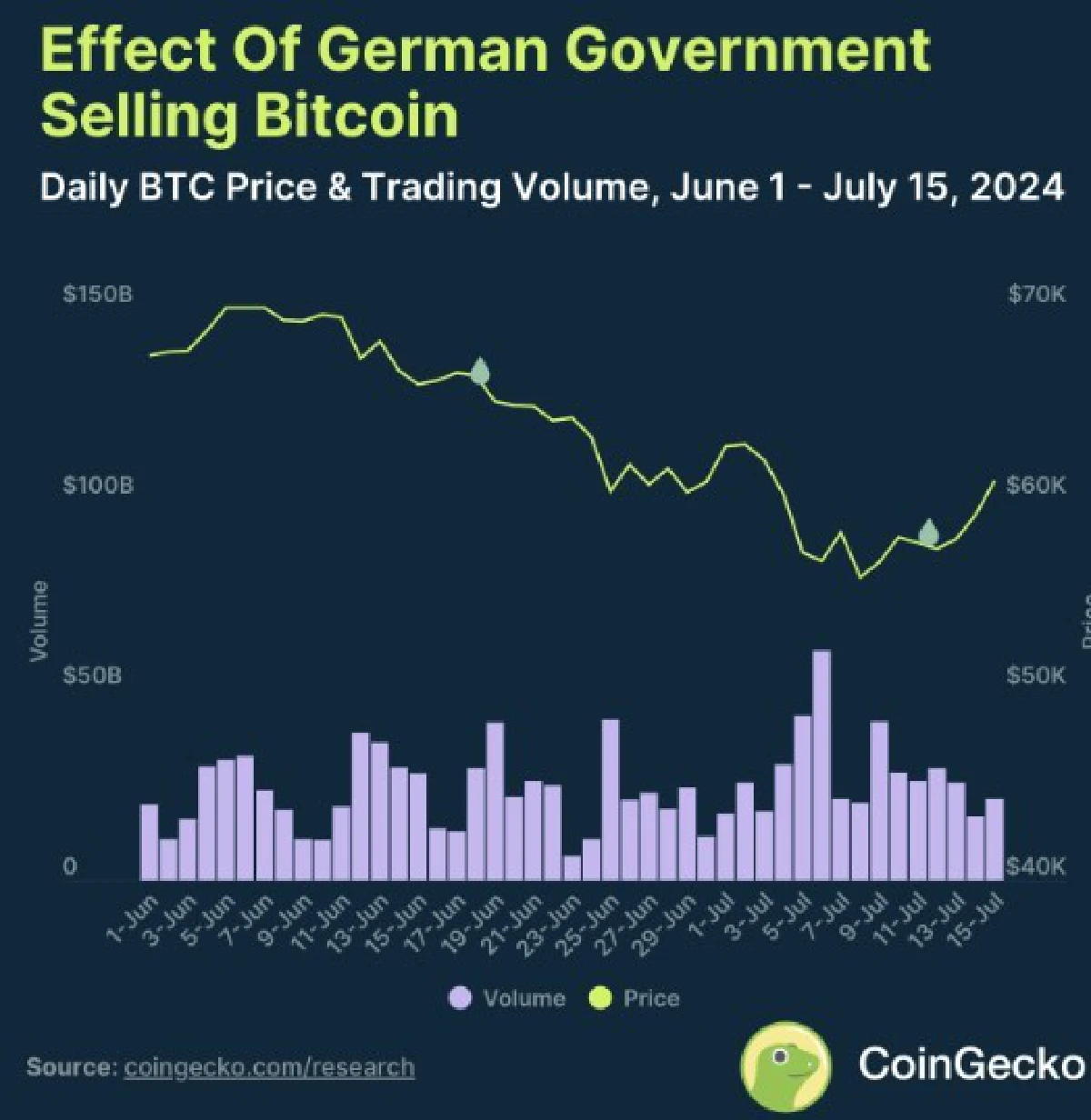 การทำธุรกรรมซื้อขายคริปโทเคอร์เรนซีของรัฐบาลที่มีสัดส่วนการถือครองคริปโทเคอร์เรนซี่จำนวนมาก สามารถก่อให้เกิดผลกระทบอย่างมีนัยสำคัญต่อราคาตลาดของคริปโทเคอร์เรนซี่ได้ จากกรณีศึกษาล่าสุดคือ กรณีที่รัฐบาลเยอรมันจำหน่าย Bitcoin ทั้งหมดที่ถือครองอยู่เป็นจำนวน 46,359 BTC ระหว่างวันที่ 19 มิถุนายน ถึง 12 กรกฎาคม 2024 จากการขาย Bitcoin ออกดังกล่าว ส่งผลทำให้ราคาตลาดของ Bitcoin ปรับตัวลดลง 15.7% จาก 64,547.32 ดอลลาร์สหรัฐ เหลือเพียง 54,418.46 ดอลลาร์สหรัฐ