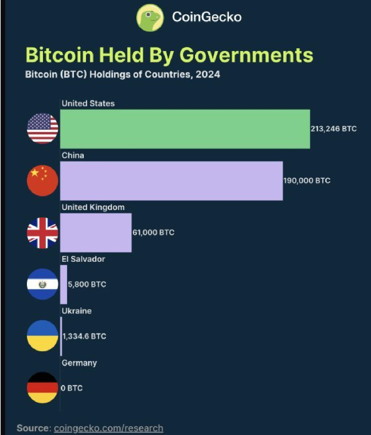 จากข้อมูล ณ วันที่ 29 กรกฎาคม 2024 ข้อมูลจาก Coingecko.com ระบุว่า รัฐบาลทั่วโลกถือครอง Bitcoin รวมกันอยู่ที่ประมาณ 2.2% ของอุปทานทั้งหมดของ Bitcoin ซึ่งคิดเป็นจำนวน 471,380.6 BTC โดยมีมูลค่าประมาณ 3.27 หมื่นล้านดอลลาร์สหรัฐ โดยรัฐบาลประเทศต่างๆ กำลังเพิ่มการถือครอง Bitcoin ไม่ว่าจะเป็นจากการยึดหรืออายัด Bitcoin จากกิจกรรมทางอาชญากรรม จากการบริจาค หรือจากกิจกรรมอื่นๆ แนวโน้มนี้สะท้อนให้เห็นถึงความสำคัญและการยอมรับในสินทรัพย์ดิจิทัลที่เพิ่มขึ้นในระบบการเงินโลก