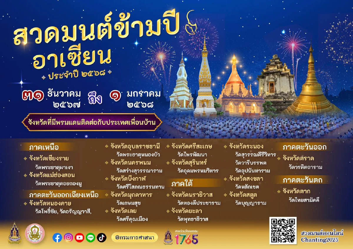 กระทรวงวัฒนธรรม โดย กรมการศาสนา ร่วมกับหน่วยงานภาครัฐและเอกชน จัดงาน สวดมนต์ข้ามปี ถวายพระราชกุศล เสริมสิริมงคลทั่วไทย ส่งท้ายปีเก่า ต้อนรับศักราชใหม่ 2568 วันที่ 31 ธันวาคม 2567 - 1 มกราคม 2568