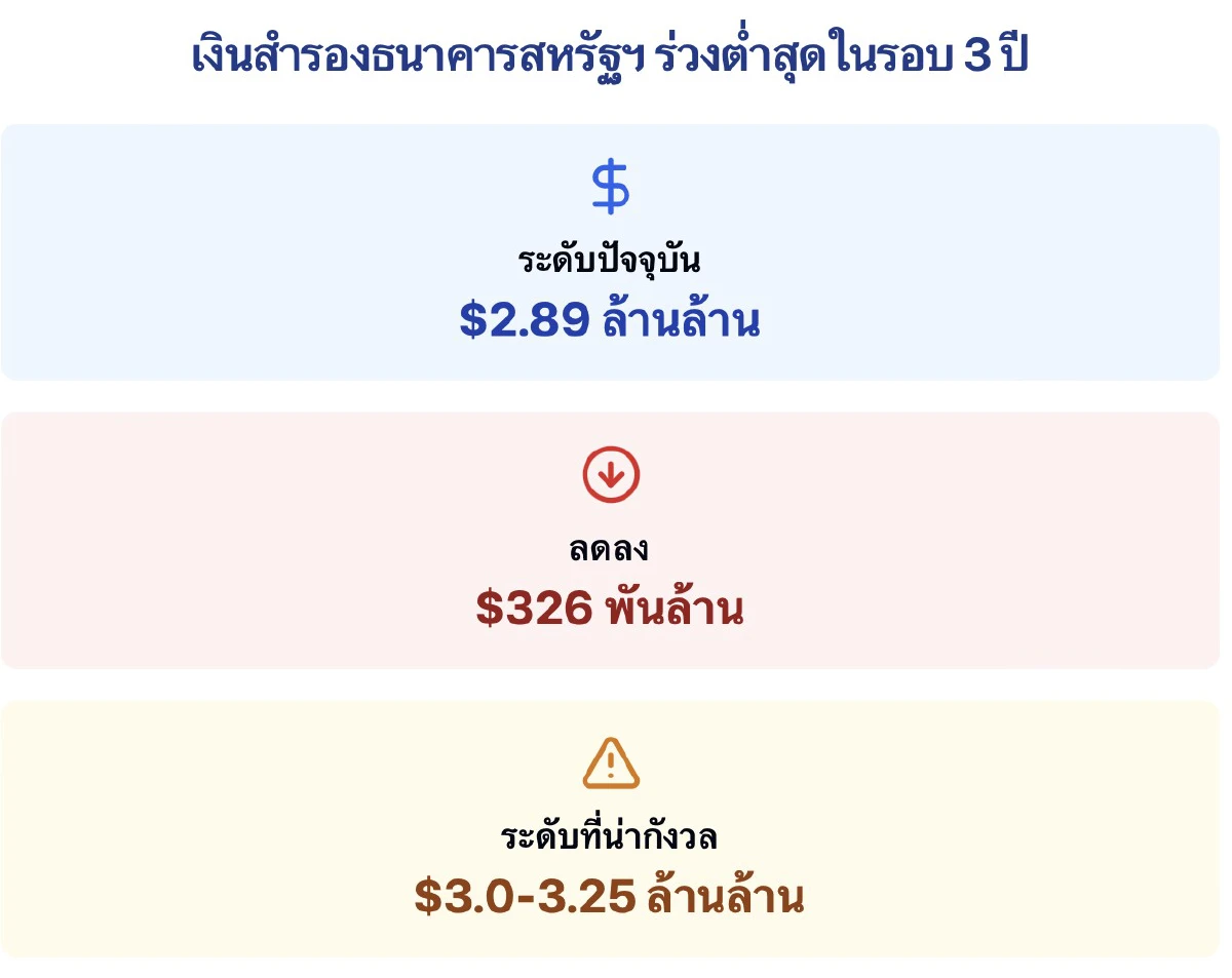 เงินสำรองในระบบธนาคารสหรัฐทรุดหนักสุดในรอบ 2 ปีครึ่ง ลดลง 3.26 แสนล้านดอลลาร์ในสัปดาห์เดียว เหลือ 2.89 ล้านล้านดอลลาร์ ขณะที่เฟดยังคงเดินหน้านโยบายลดขนาดงบดุล ท่ามกลางความกังวลว่าเงินสำรองอาจลดลงมากจนกระทบเสถียรภาพตลาดการเงิน