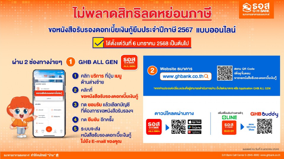 ธอส. เปิดขอหนังสือรับรองดอกเบี้ยเงินกู้ด้วยตัวเอง ใช้ลดหย่อนภาษี ปี 67 ผ่าน 2 ช่องทาง แอปพลิเคชัน GHB ALL GEN และ www.ghbank.co.th เริ่ม 6 ม.ค.นี้