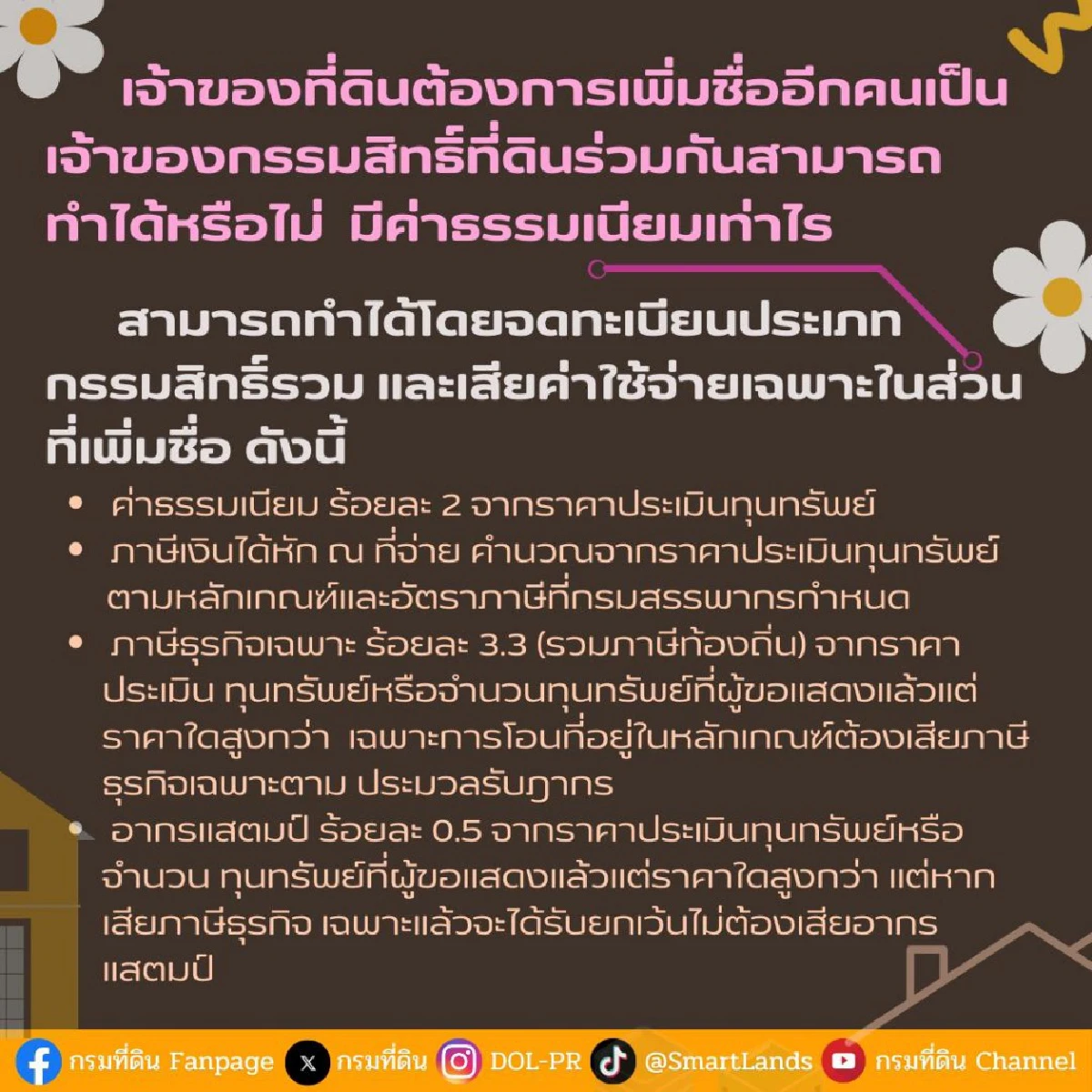"กรมที่ดิน" ตอบชัดคลายข้อสงสัย “เจ้าของที่ดินต้องการเพิ่มชื่ออีกคนเป็น เจ้าของกรรมสิทธิ์ที่ดินร่วมกัน” สามารถทำได้ไหม? มีค่าธรรมเนียมเท่าไร