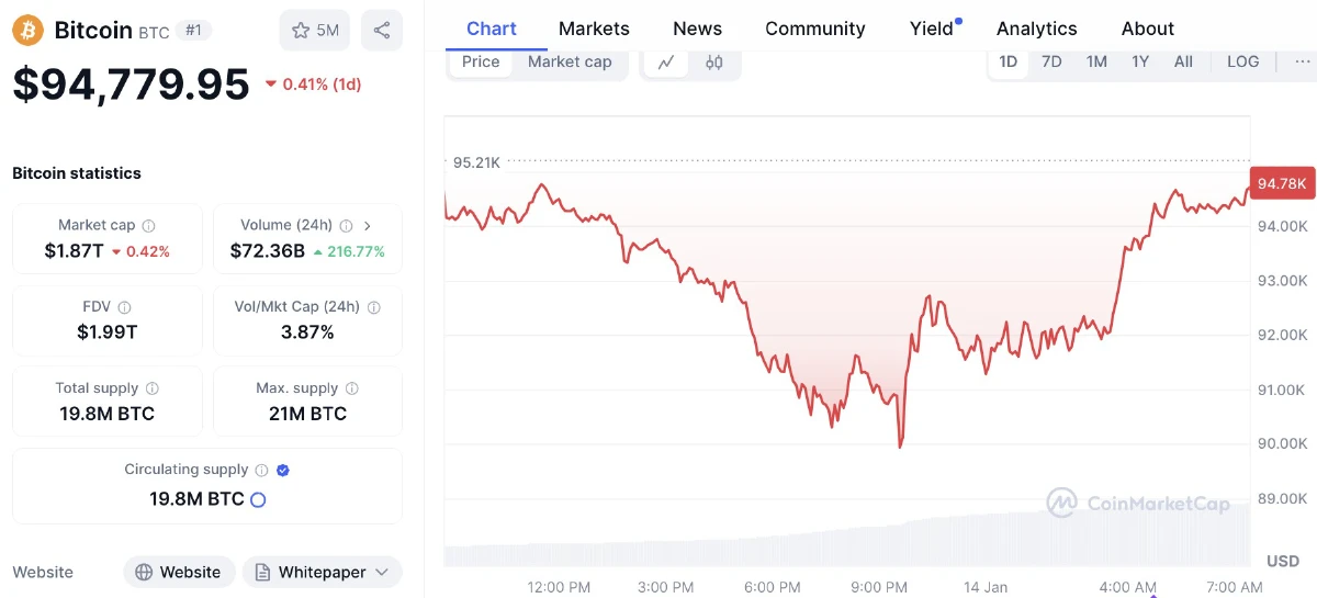 “บิตคอยน์” บิตคอยน์วันนี้ (14 ม.ค.) ราคาบิตคอยน์ ลดลงกว่า 5.3% มาอยู่ที่ระดับต่ำสุด 89,329 ดอลลาร์ ในช่วงกลางดึก ก่อนที่จะฟื้นตัวขึ้นมาเคลื่อนไหวที่ระดับ 94,563.97 ดอลลาร์ ซึ่งเป็นระดับต่ำสุดในรอบเกือบ 2 เดือน ตั้งแต่วันที่ 18 พฤศจิกายน 67 และต่ำกว่าระดับสูงสุดที่ 108,316 ดอลลาร์เมื่อเดือนธันวาคม 67 ถึง 17.52%