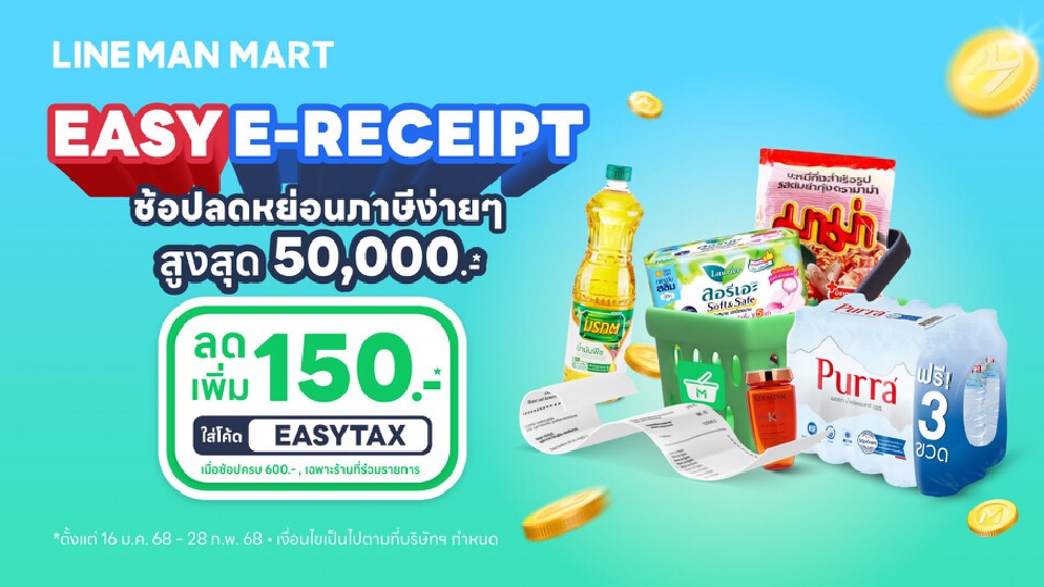 ทางด้าน LINE MAN MART เข้าร่วมโครงการเช่นกัน โดยผู้ใช้บริการสามารถเลือกช้อปสินค้าจากร้านค้าที่ร่วมรายการกว่า 1,716 แห่ง และสามารถนำค่าใช้จ่ายไปลดหย่อนภาษีภายใต้ มาตรการ Easy E-Receipt 2568 ได้สูงสุดถึง 50,000 บาท พร้อมรับส่วนลดพิเศษ 20% สำหรับทั้งลูกค้าเก่าและใหม่ เพียงใช้โค้ด EASYTAX และสั่งซื้อขั้นต่ำ 600 บาท