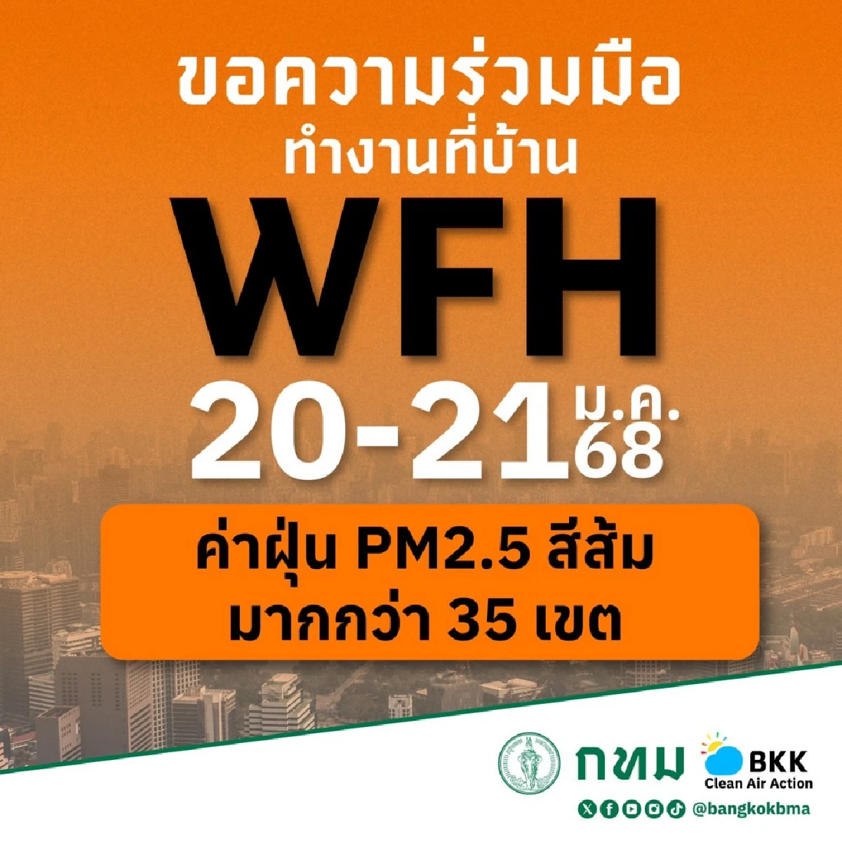 จึงประกาศ WFH ในวันที่ 20 - 21 ม.ค. 68 ซึ่งยังคงต้องเฝ้าติดตามสถานการณ์อย่างใกล้ชิด หากพบว่าฝุ่น PM2.5 ยังคงมีแนวโน้มสูงขึ้นต่อเนื่อง จะประกาศ WFH ต่อไปจนถึงวันที่ 24 ม.ค. 68 โดยได้มีการสื่อสารประชาสัมพันธ์ให้กับภาคีเครือข่าย WFH รับทราบล่วงหน้า เพื่อให้สามารถวางแผนการทำงานล่วงหน้า และลดผลกระทบกับหน่วยงานภาคส่วนต่าง ๆ ที่เข้าร่วม