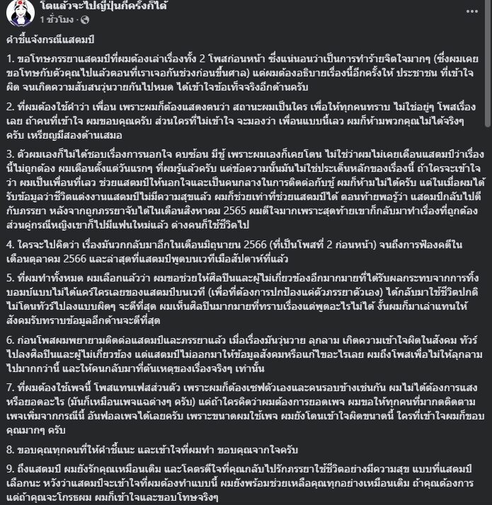 1.ขอโทษภรรยาแสตมป์ที่ผมต้องเล่าเรื่องทั้ง 2 โพสต์ก่อนหน้า ซึ่งแน่นอนว่าเป็นการทำร้ายจิตใจมากๆ (ซึ่งผมเคยขอโทษกับตัวคุณไปแล้วตอนที่เราเจอกันช่วงก่อนขึ้นศาล) แต่ผมต้องอธิบายเรื่องนี้อีกครั้งให้ ประชาชน ที่เข้าใจผิด จนเกิดความสับสนวุ่นวายกันไปหมด ได้เข้าใจข้อเท็จจริงอีกด้านครับ