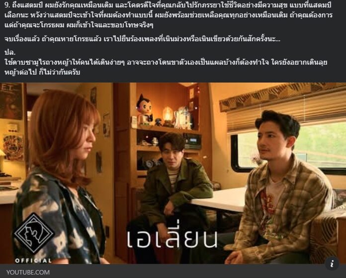 9.ถึงแสตมป์ ผมยังรักคุณเหมือนเดิม และโคตรดีใจที่คุณกลับไปรักภรรยาใช้ชีวิตอย่างมีความสุข แบบที่แสตมป์เลือกนะ หวังว่าแสตมป์จะเข้าใจที่ผมต้องทำแบบนี้ ผมยังพร้อมช่วยเหลือคุณทุกอย่างเหมือนเดิม ถ้าคุณต้องการ แต่ถ้าคุณจะโกรธผม ผมก็เข้าใจและขอโทษจริงๆ