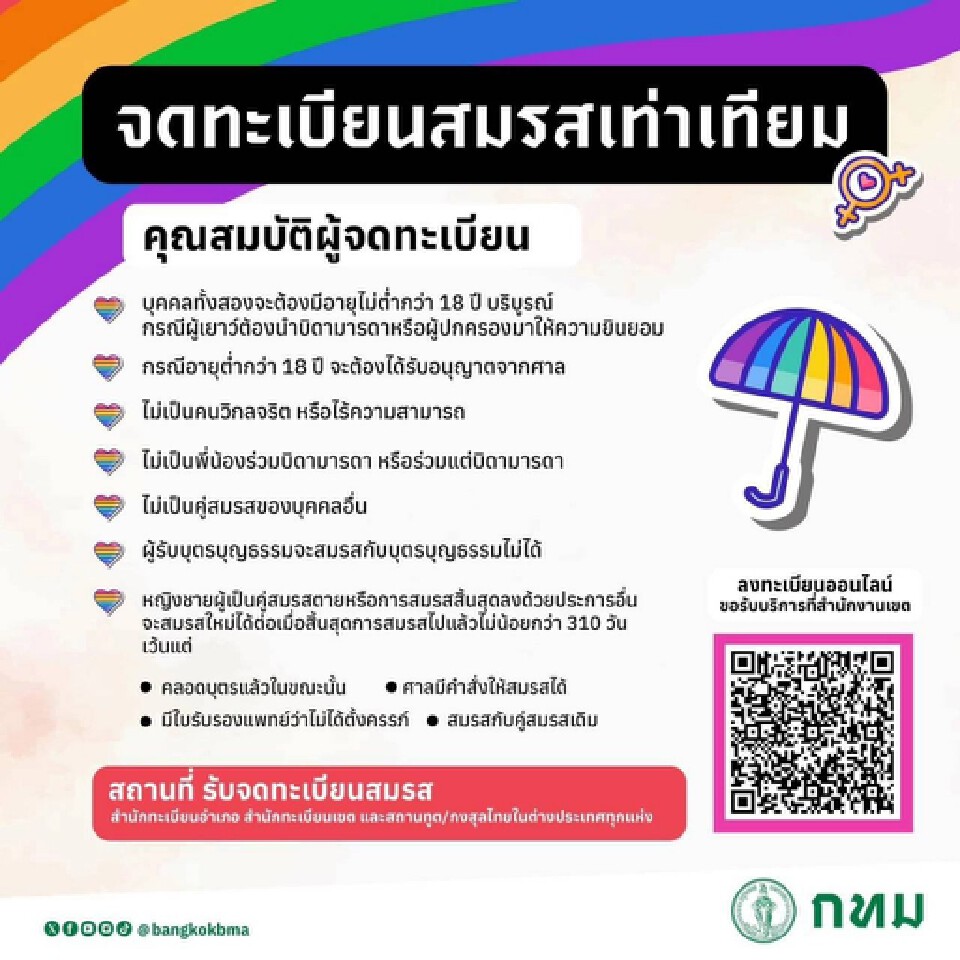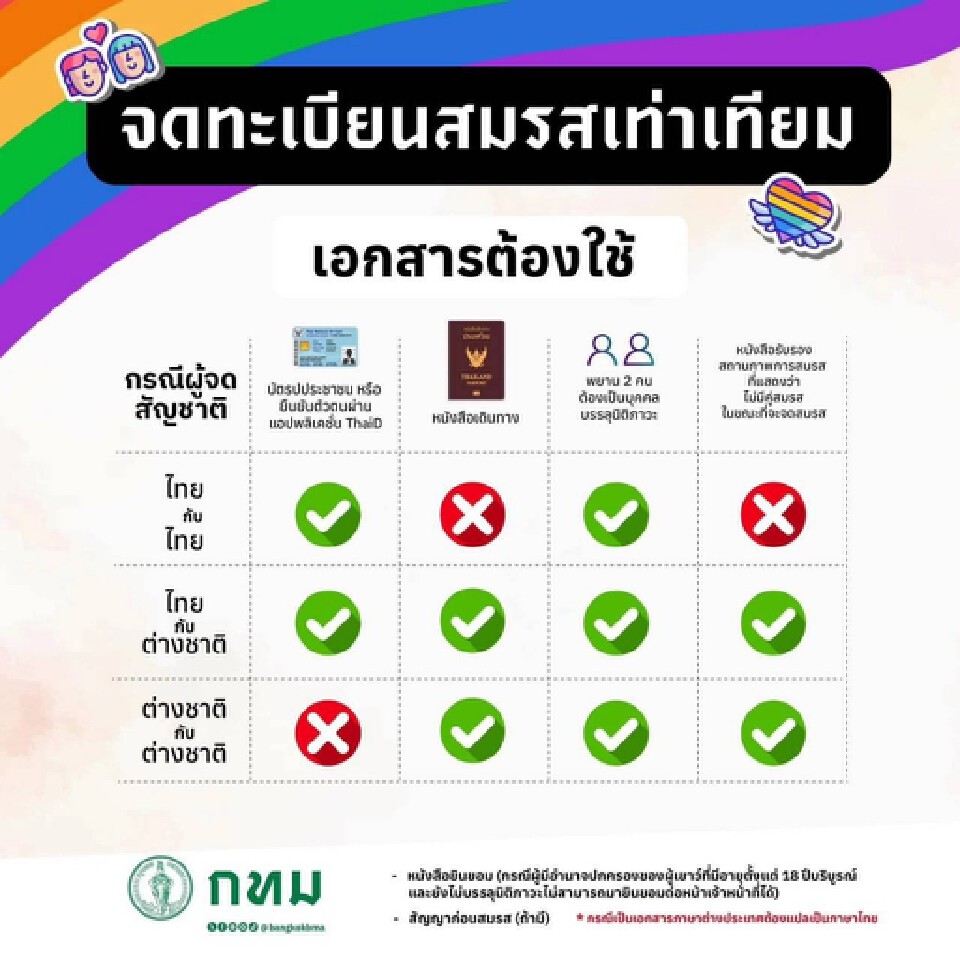 วันที่ 23 มกราคม 2568 ถือเป็นวันแรกที่กฎหมายสมรสเท่าเทียมจะมีผลบังคับใช้ โดยคู่รักที่มีความหลากหลายทางเพศ สามารถจดทะเบียนสมรสเท่าเทียมกันได้ สำหรับใครที่อยู่ต่างจังหวัด ทางกรมการปกครอง ได้เปิดให้จดทะเบียนสมรสเท่าเทียมได้ที่ 878 อำเภอทั่วประเทศ ส่วนใครที่อยู่กรุงเทพมหานคร สามารถเดินทางไปที่สำนักงานเขต 50 แห่งได้เลย หรือใครที่อยู่ต่างประเทศ สามารถติดต่อสถานทูต/กงสุลไทยในต่างประเทศทุกแห่ง ทั้งนี้สามารถตรวจสอบเงื่อนไขรายละเอียดก่อนจดทะเบียนได้ดังนี้