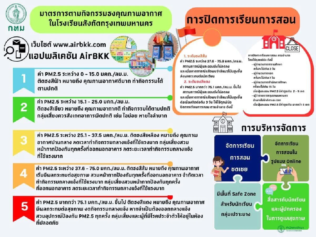 ที่มา :ฝุ่นพิษสูงเกินมาตรฐาน กทม. สั่งปิดโรงเรียน 195 แห่ง เฝ้าระวังค่าฝุ่น PM 2.5