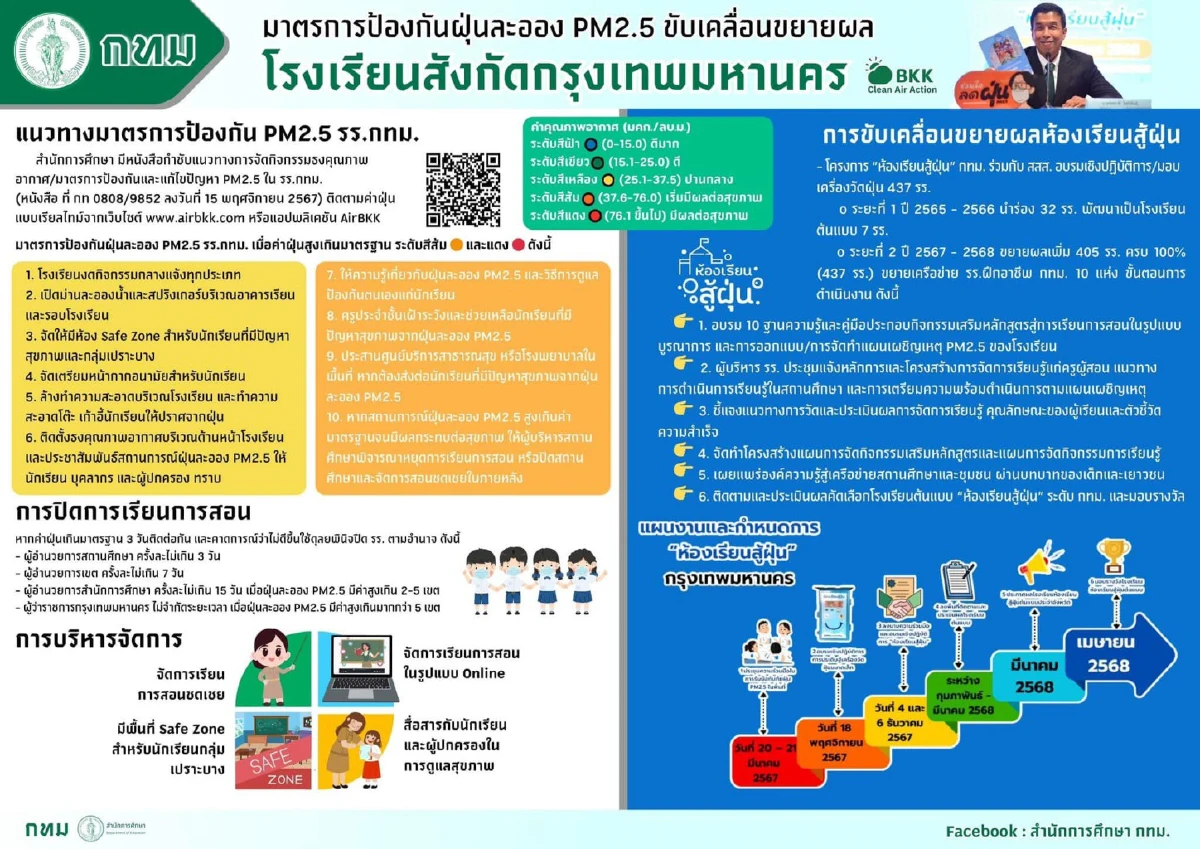 กรุงเทพมหานคร โดยสำนักการศึกษา ได้มีจัดทำแนวปฏิบัติและแนวทางการป้องกันฝุ่นและแก้ไขปัญหาฝุ่นละออง PM2.5 ในโรงเรียนสังกัดกรุงเทพมหานคร