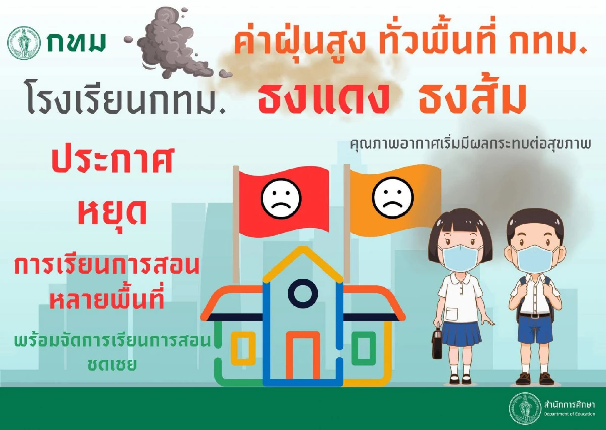 ฝุ่นพิษแรง! สูงเกินมาตรฐาน กทม. สั่งปิดโรงเรียนเพิ่ม 195 แห่ง เฝ้าระวังค่าฝุ่น อัปเดตสถานการณ์ฝุ่น PM 2.5 อย่างใกล้ชิด คุณภาพอากาศไม่ดี ระดับสีแดงเดือด - สีส้ม เริ่มมีผลกระทบต่อสุขภาพประชาชน โดยให้โรงเรียนกำหนดจัดการเรียนการสอนออนไลน์ ให้นักเรียน - เรียนชดเชยในภายหลัง