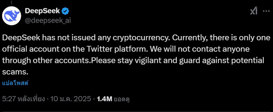 ในโพสต์ที่ปักหมุดไว้บน X (Twitter) เมื่อวันที่ 10 มกราคม DeepSeek ยืนยันว่า“DeepSeek ไม่เคยออกคริปโตเคอร์เรนซีใดๆ ปัจจุบันเรามีเพียงบัญชีทางการบน Twitter เท่านั้น และจะไม่ติดต่อผ่านบัญชีอื่นใด โปรดระมัดระวังและหลีกเลี่ยงการถูกหลอกลวง”