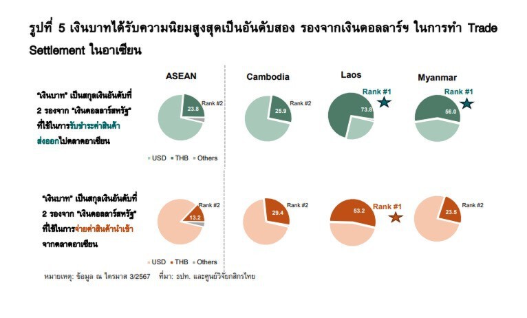 ไทยเก่งอะไร? จากสายตาของต่างชาติ ไทยถูกมองว่ามีจุดแข็งหลายด้าน โดยในมิติของการค้าภายในอาเซียน เงินบาทเป็นสกุลเงินที่ได้รับความนิยมมากที่สุด รองจากสกุลเงินดอลลาร์ฯ ในการรับชำระค่าสินค้าส่งออก และจ่ายเป็นค่าสินค้านำเข้า กับคู่ค้าในตลาดอาเซียน โดยเฉพาะการค้ากับกัมพูชา สปป. ลาว และเมียนมาร์ (รูปที่ 5)