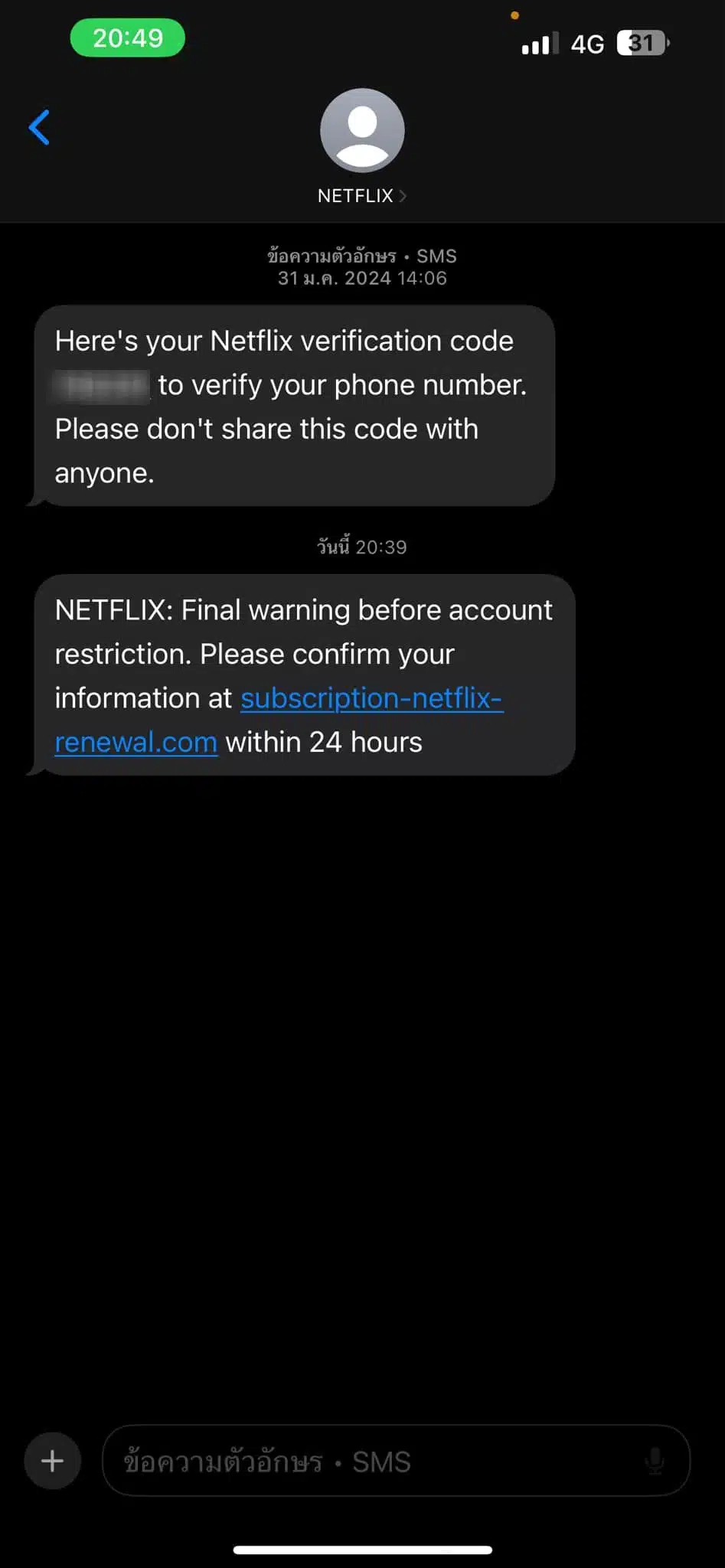 ช่วงนี้คนในสังคมพบเจอมิจฉาชีพในรูปแบบต่าง ๆ ที่มักจะหาวิธีการหลอกล่อหรือช่องทางใหม่ ๆ เพื่อให้เหยื่อหลงเชื่อ ล่าสุด ผู้ใช้เฟซบุ๊กรายหนึ่งได้ออกมาเตือนภัยมิจฉาชีพรูปแบบใหม่ เธอได้รับ SMS อ้างว่าบัญชีเน็ตฟลิกซ์ (Netflix) จะถูกระงับ เนื่องจากตัดค่าบริการจากบัตรเครดิตไม่ได้ ในตอนแรกเธอก็คิดว่าอาจจะเป็นมิจฉาชีพ แต่ข้อความที่ส่งมาดูน่าเชื่อถือเพราะมาจากเบอร์เดียวกับที่เน็ตฟลิกซ์เคยส่งข้อความจริงมาก่อนหน้านี้