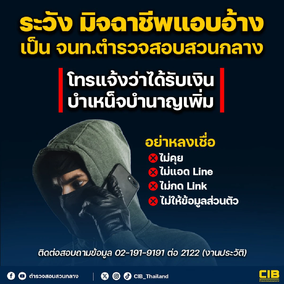 วันนี้ขอให้ระวัง มิจฉาชีพแอบอ้างเป็น จนท.ตำรวจสอบสวนกลาง (CIB) โทรแจ้งว่าได้รับเงินบำเหน็จบำนาญเพิ่ม