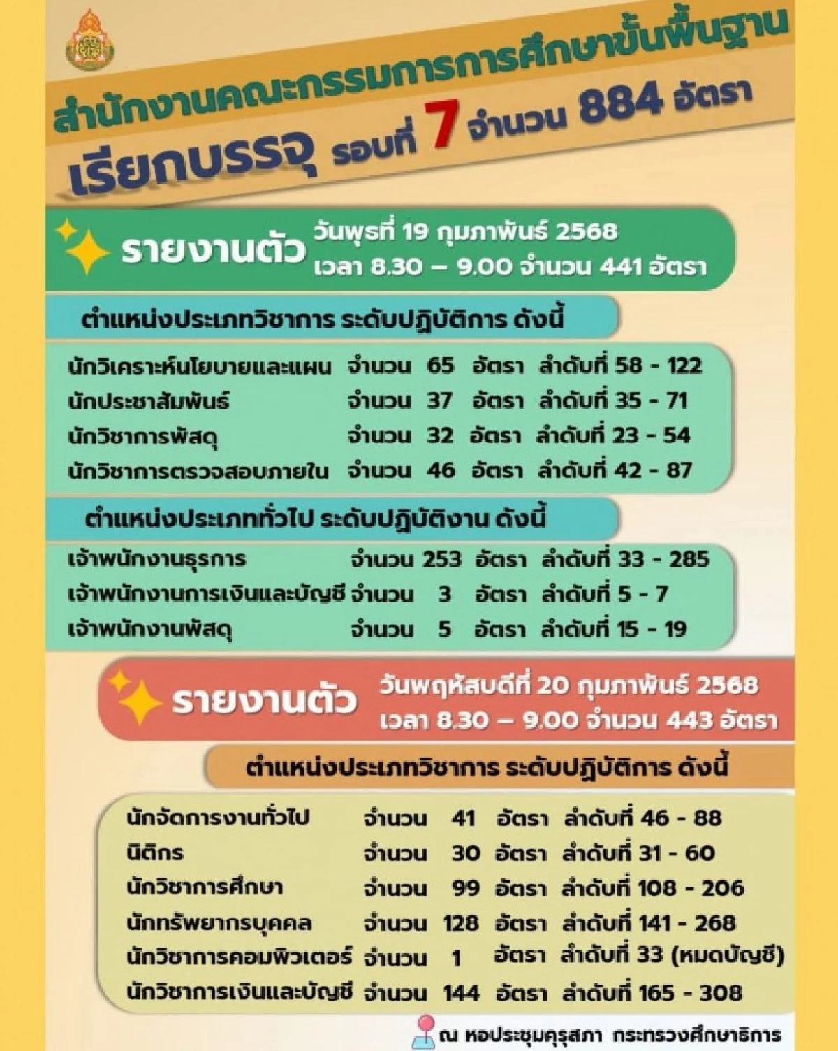 สํานักงานคณะกรรมการการศึกษาขั้นพื้นฐาน จะเรียกบรรจุและแต่งตั้งผู้สอบแข่งขันได้ (ครั้งที่ 7)จํานวน 884 ราย (ตําแหน่งว่าง จํานวน 891 อัตรา) ดังนี้
