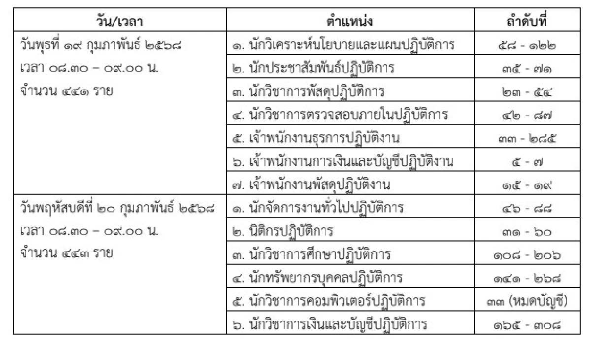 ลําดับที่เรียกบรรจุราชการ 2568 และแต่งตั้งวันพุธที่ 19 กุมภาพันธ์ 2568 เวลา 08.30 – 09.00 น. จํานวน 441 ราย ประกอบด้วย