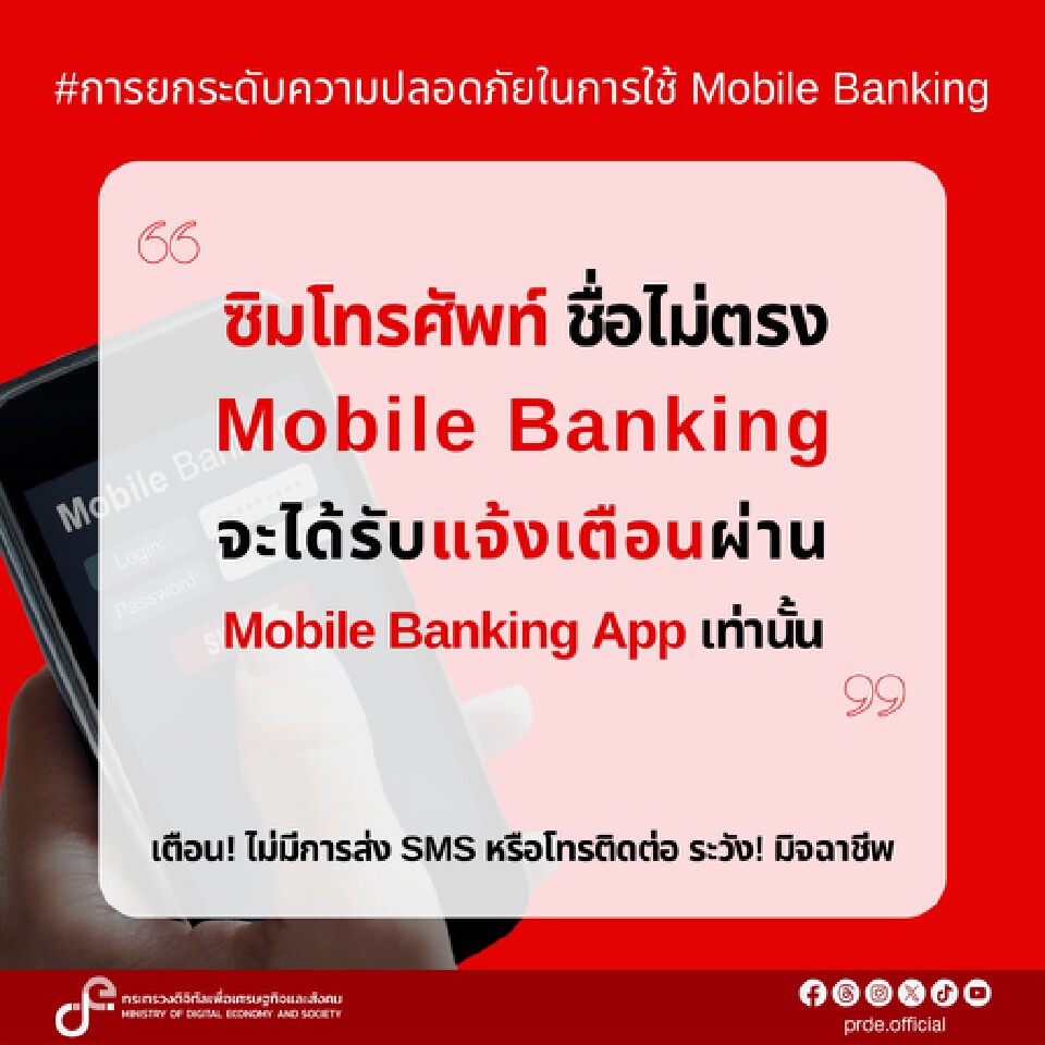 ดีอี ย้ำ มาตรการ “Mobile Banking” แจ้งเตือนปชช. ผ่าน แอปฯ ธนาคาร เท่านั้น