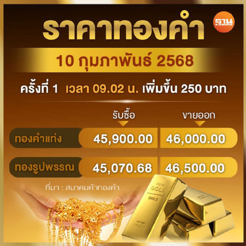 ที่มา :ราคาทองวันนี้ 10 กุมภาพันธ์ 2568 ราคาทองปรับเพิ่มขึ้น 250 บาท