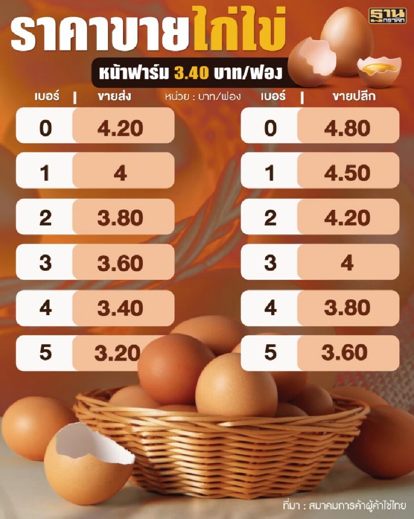 ที่มา :ด่วน ! วันนี้ (10 ก.พ.68) ราคาไข่ไก่ ปรับลด 20 สตางค์ หรือ 6 บาท/แผง